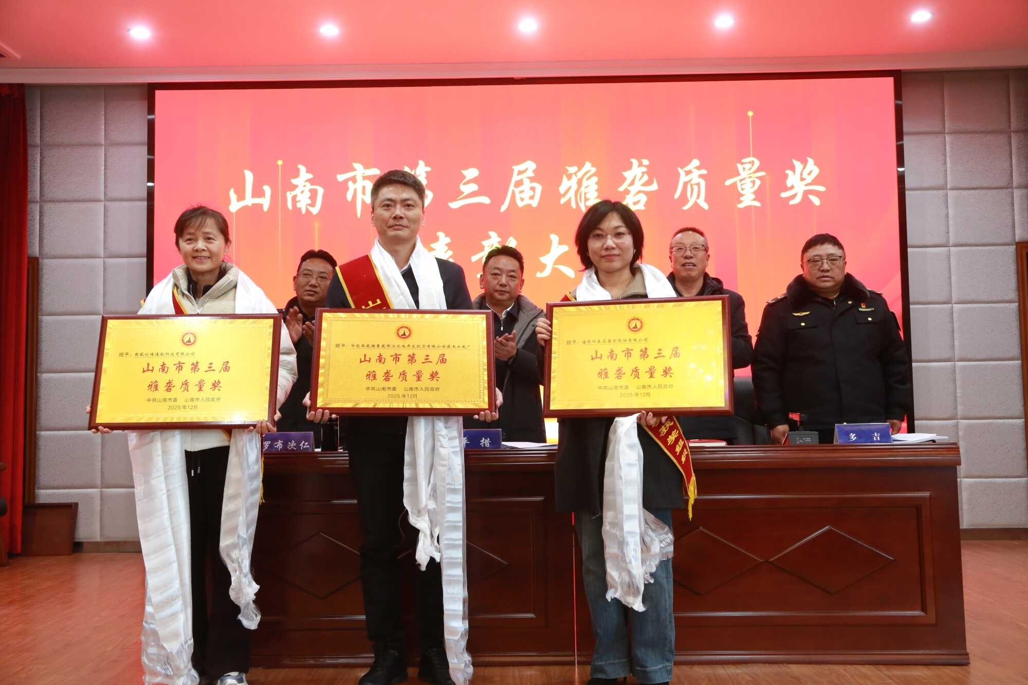 2月9日,我市召开第三届雅砻质量奖表彰大会,向荣获第三届雅砻质量奖的华能西藏雅鲁藏布江水电开发投资有限公司藏木水电厂、海思科医药集团股份有限公司和西藏创博通航科技有限公司三家企业颁发荣誉证书。